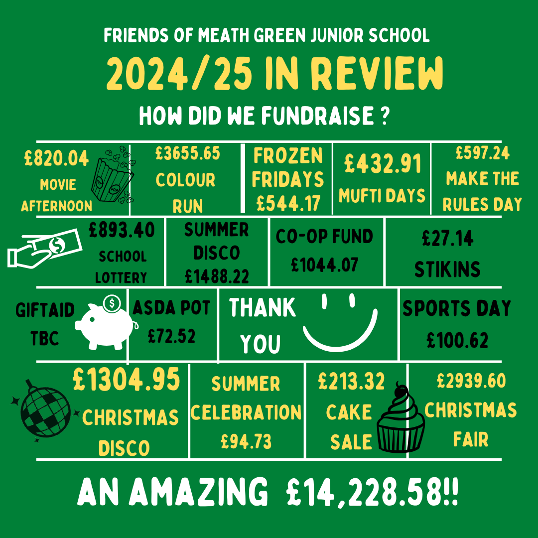 All parents and guardians are automatically Friends of Meath Green Junior School (FOMGJS) - everyone is welcome. The Friends Committee is a group of enthusiastic volunteers who commit their time and energy to ensure that the children of MGJS enjoy fun activities and events throughout the year whilst raising necessary funds. We also try to keep the FUN in Fundraising!